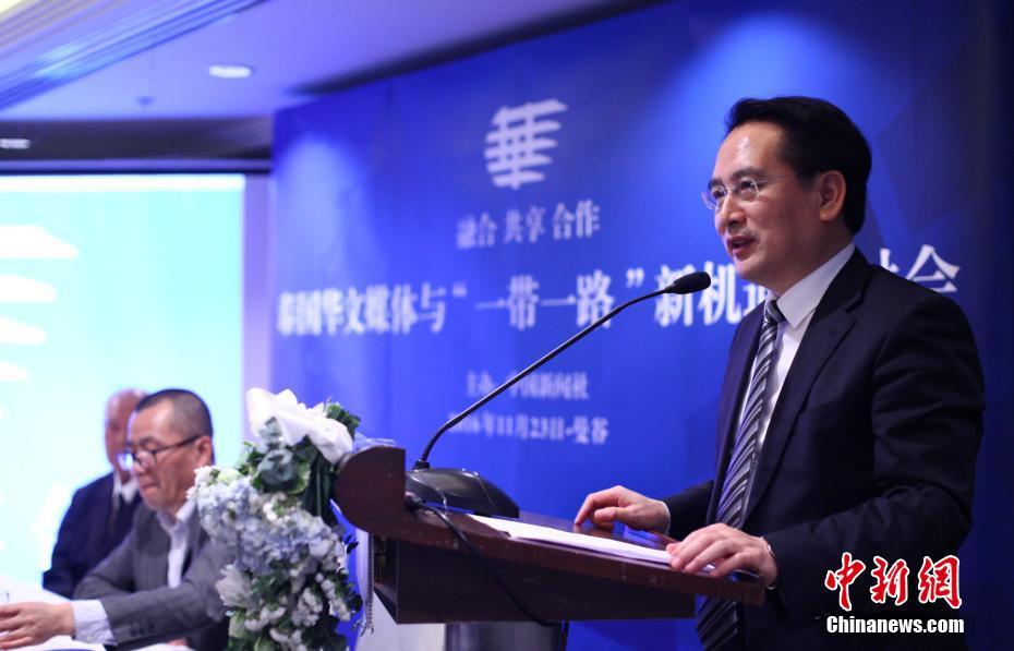 11月23日下午,由中国新闻社主办的泰国华文媒体与“一带一路”新机遇研讨会在曼谷举行,泰国当地30余家媒体、侨团、企业等机构代表与会。中国国务院侨务办公室副主任谭天星出席会议并讲话。
